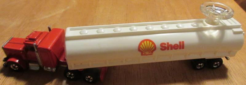 Hot Wheels Peterbilt Hauler - 1981 - This Shell oil tanker actually has 2 separate parts: the cab and the tank. It apparently is 1:64, so it's as long as several regular cars. The knob on top of the tank steers the cab to and fro.