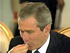 Whenever he gets angry, Dumbya stomps into his office, slams the door behind him like a little baby, and starts chomping on a huge wad of Super Bubble. All the while, he hurls his reading glasses across the room. He once cracked the glass on a family portrait by throwing his glasses in a fit of rage.