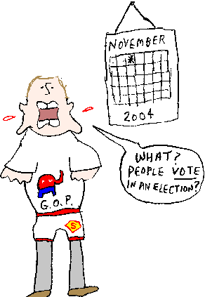 Of course none of this may matter. With the system of checks and balances wiped out at the federal level, what are the odds the Bosh regime won't cancel the congressional elections if it looks like the Republicans will lose power? That they seriously considered canceling the presidential election (remember that?) should be a warning sign, but we're worried that if elections for anything other than President are called off, it will be one of these things we keep having to bring up for years afterward but everybody else seems to instantly forget. (Like when the court ruled against BBS members whose private e-mail was seized when the BBS they used got illegally raided. Or how Rick Lazio hated the guts of the poor so much that he got a law passed to require public housing residents to perform unpaid labor. Or how right-wing federal judges legislated from the bench by saying cities in California couldn't ban excessive bank fees. Or how the Swen virus targeted progressive e-mail lists.)